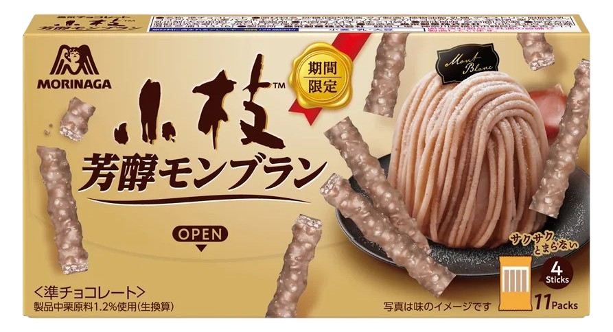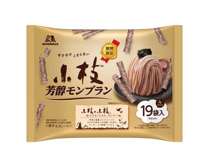 イタリア産栗のパウダーを生地に練り込み、焼き栗の香りをほんのり加えた芳醇なモンブラン味の枝形チョコレートです。パキッとした食感と栗の深い風味を楽しめます。