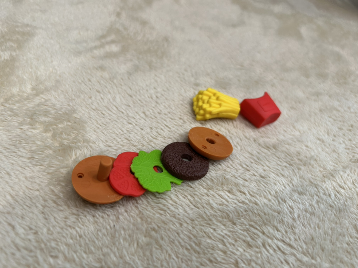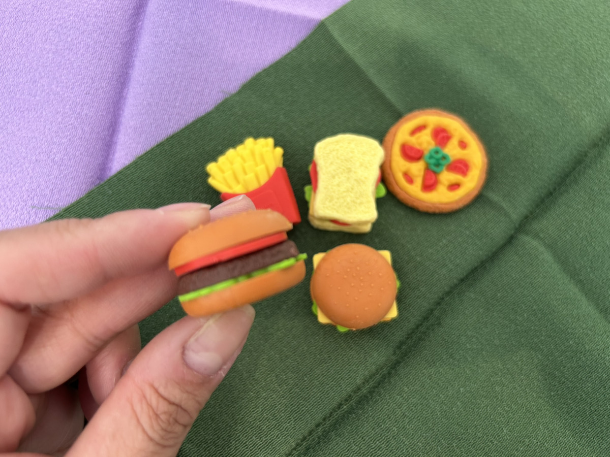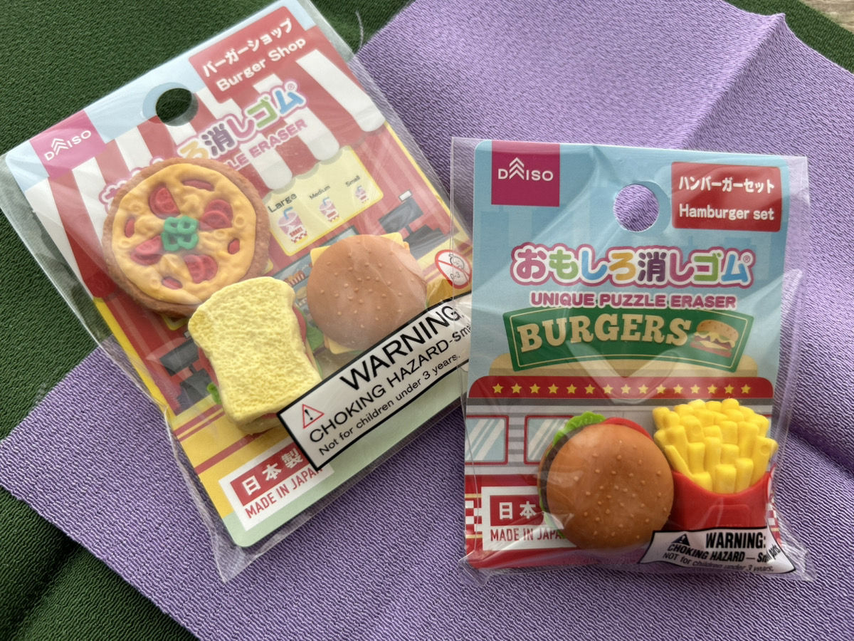 There are also two different burger-themed eraser sets, and what’s interesting is that the hamburgers are made differently in each.
