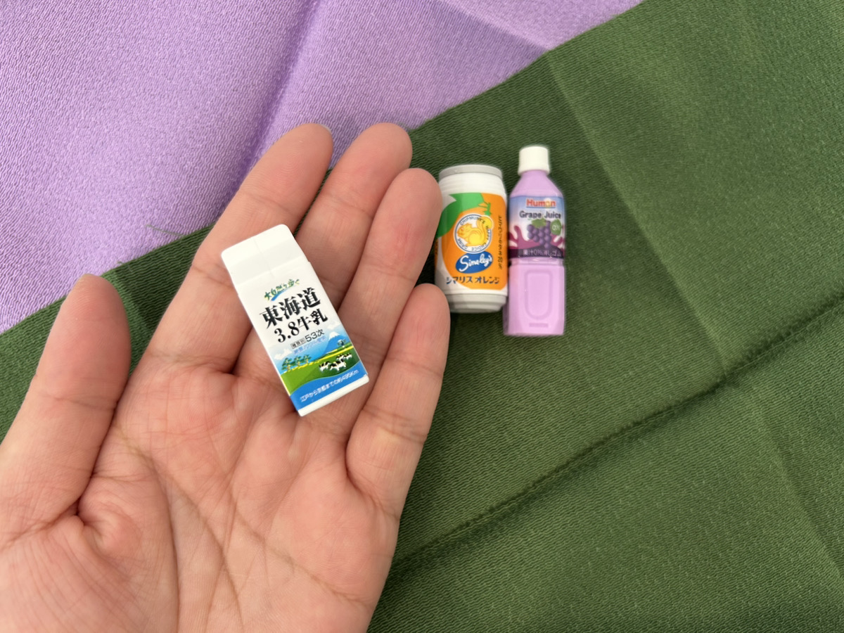 Each package is carefully detailed to look just like the real thing. Even the cap of the grape juice is made as an eraser! The milk carton even has Japanese writing on it, giving it that authentic Japanese touch.