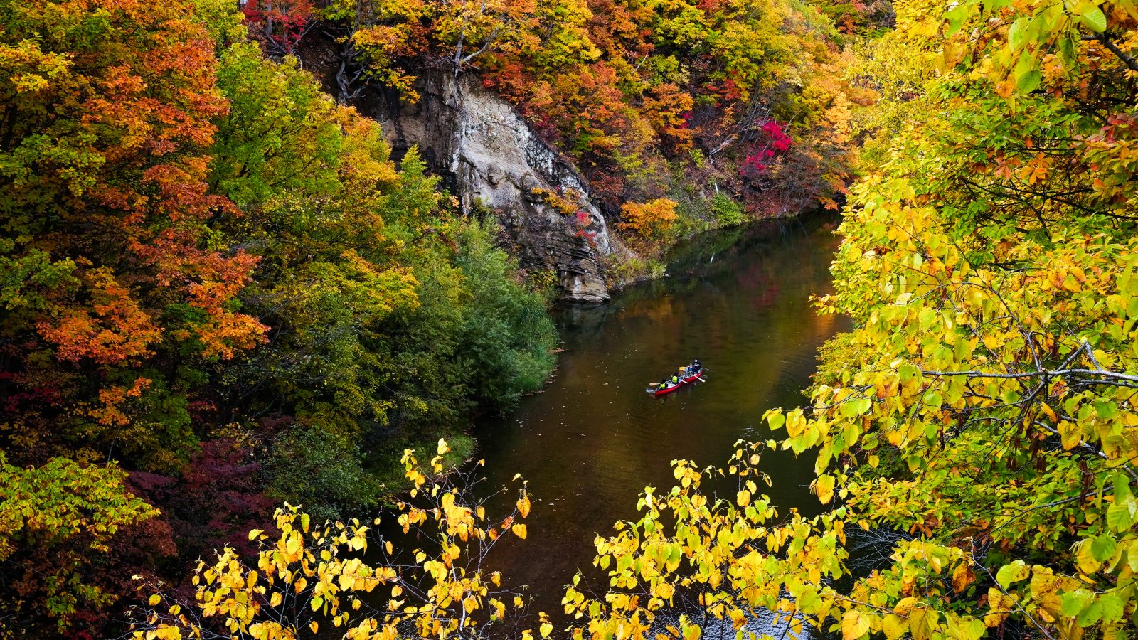 Vào mùa lá đỏ, bạn có thể ngắm cảnh khi chèo thuyền kayak, đi thuyền dọc theo hẻm núi hoặc ngắm nhìn toàn cảnh từ trên cao bằng cáp treo.