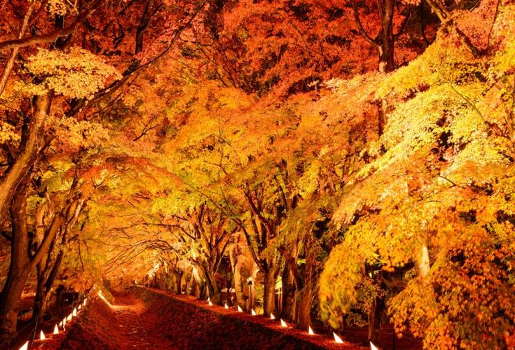 Hành lang lá đỏ Maple Corridor bên hồ Kawaguchi, dưới chân núi Phú Sĩ, là một trong những điểm ngắm lá đỏ nổi tiếng nhất Nhật Bản. Hơn 100 cây phong cổ thụ tạo thành một đường hầm rực rỡ màu đỏ và vàng, nổi bật trên nền núi Phú Sĩ.