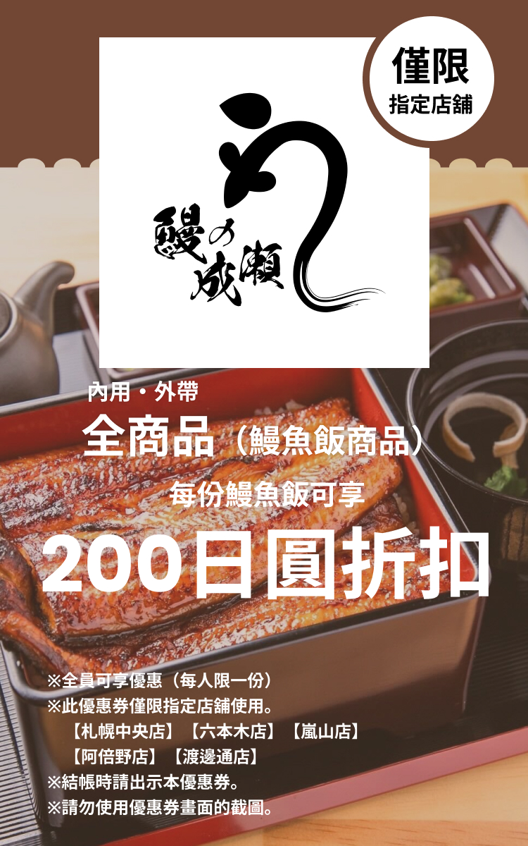 持券本人(或包含本人在內的團體)所點的鰻魚飯皆可折扣
