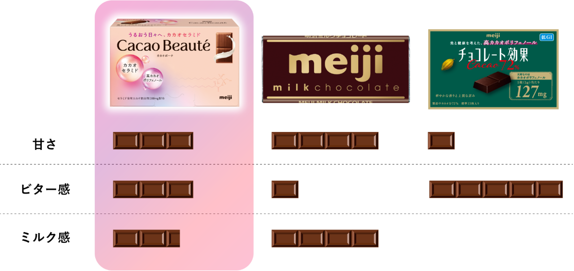 日本のチョコレートメーカー「明治」が開発した「カカオセラミド×ポリフェノール」配合のミルクチョコレート「Cacao Beauté(カカオボーテ)」です。