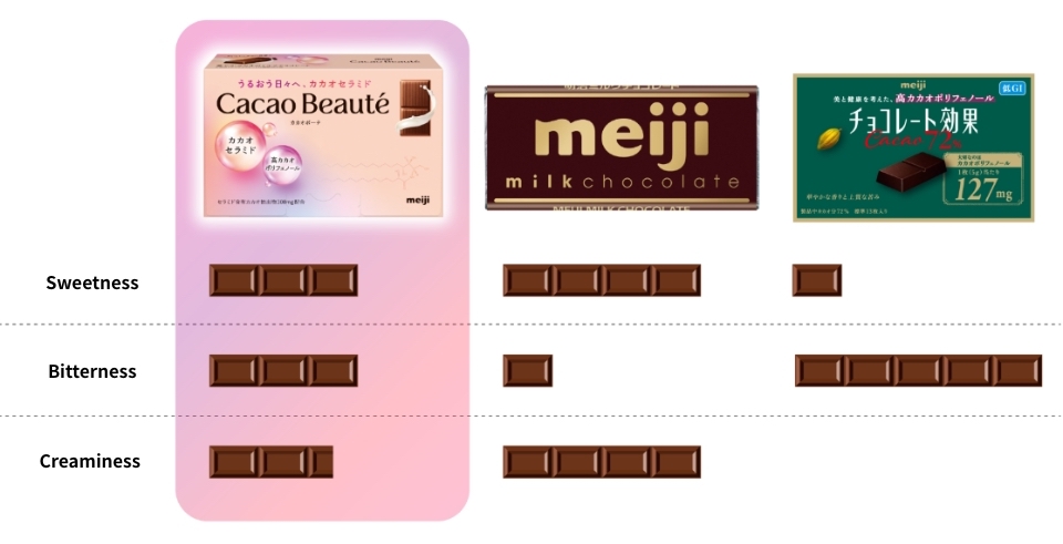 So với “Milk Chocolate” và “Chocolate Kouka” của Meiji, Cacao Beauté có sự cân bằng hài hòa giữa vị ngọt, vị đắng và hương sữa béo.