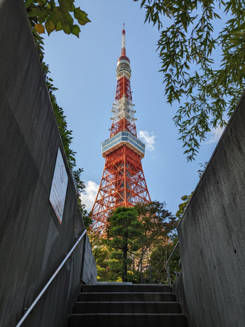 ไม่มีสัญลักษณ์ชัดเจน แต่แค่เดินไปในทิศทางของโตเกียวทาวเวอร์ หอคอยสีแดงจะปรากฏตรงปลายทางลาดอย่างเป็นธรรมชาติ